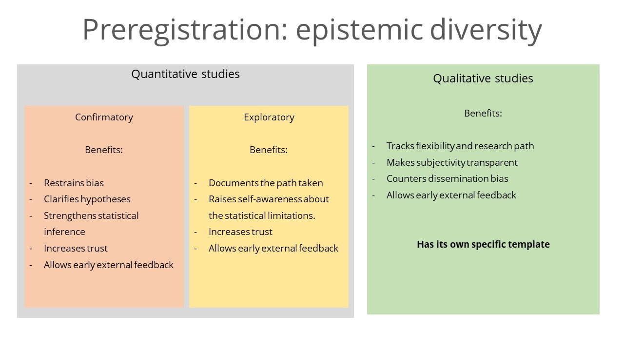 Preregistration is the practice of documenting your research plan at the beginning of your study and storing that plan in a read-only public repository such as OSF Registries. Used primarily as a tool in earlier years to counteract biases and to register hypotheses prior to data collection, preregistrations now come in diverse shapes and forms to accommodate the needs of epistemic diversity. OSF provides many different templates, these include among others: • Standard templates (for confirmatory or exploratory use) • Systematic review templates • Template for qualitative research